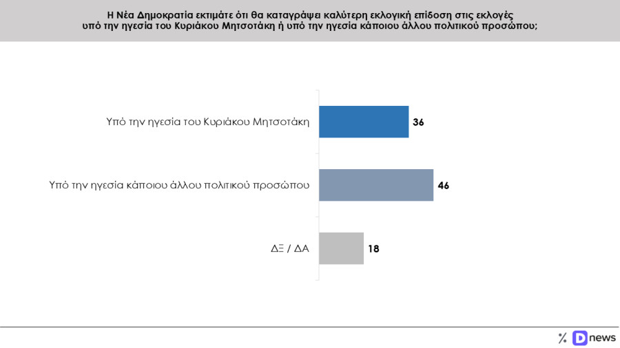 Το 46% των ψηφοφόρων εκτιμά ότι υπό την ηγεσία άλλου πολιτικού προσώπου η ΝΔ θα πάει καλύτερα απ΄ ότι με τον Κυριάκο Μητσοτάκη. Εν αντιθέσει με το 36% που πιστεύει ότι η ΝΔ θα πάει καλύτερα υπό την ηγεσία Μητσοτάκη.