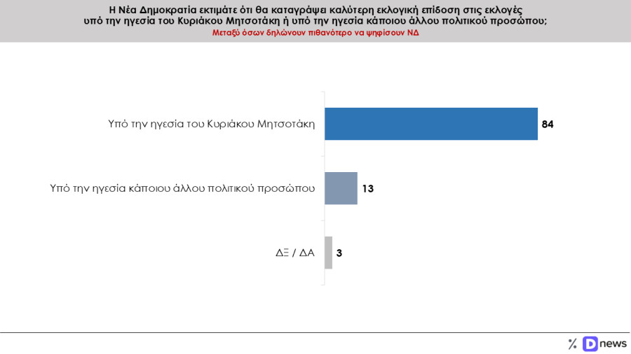 Η κατάσταση αναστρέφεται εντυπωσιακά μεταξύ των ψηφοφόρων της ΝΔ, όπου το 84% εκτιμά ότι η ΝΔ θα σημειώσει καλύτερη εκλογική επίδοση υπό την ηγεσία του Κυριάκου Μητσοτάκη και μόλις το 13% πιστεύει ότι το κυβερνών κόμμα θα σημειώσει καλύτερη εκλογική επίδοση με άλλον επικεφαλής.