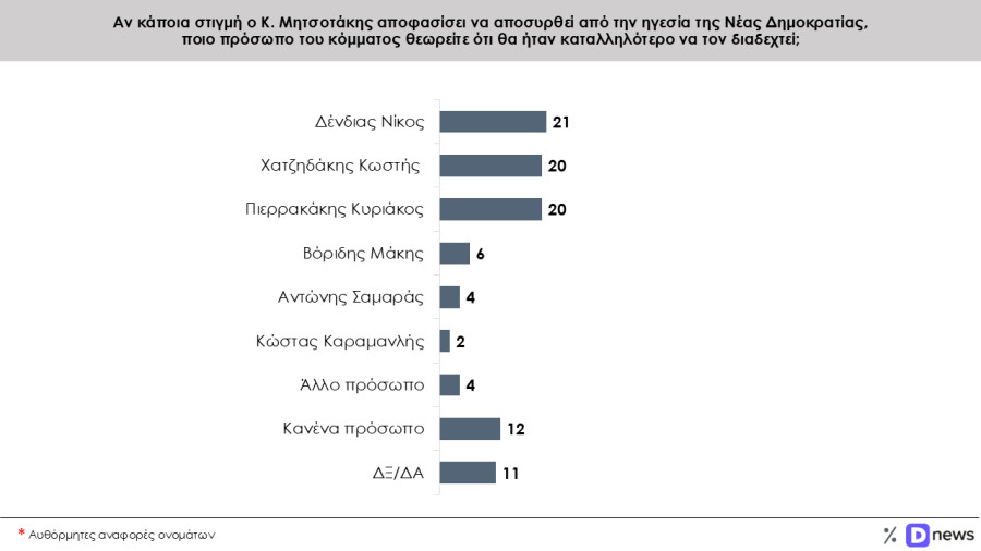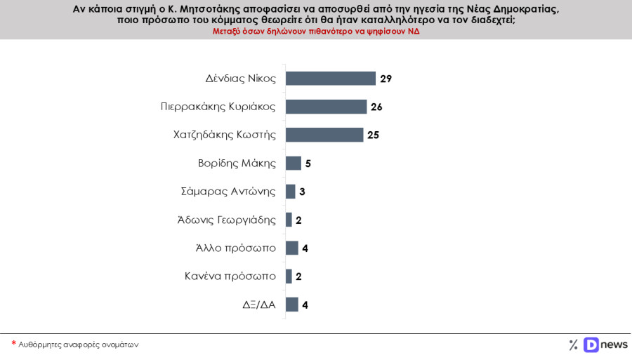 Τα παραπάνω προκύπτουν από τη μεγάλη δημοσκόπηση της Prorata για λογαριασμό του Dnews, ενώ ενδιαφέρον εμφανίζουν και οι απαντήσεις στο ερώτημα «αν κάποια στιγμή ο Κ. Μητσοτάκης αποφασίσει να αποσυρθεί από την ηγεσία της ΝΔ ποιο πρόσωπο του κόμματος θεωρείτε ότι θα ήταν καλύτερο να τον διαδεχθεί». Σημειωτέο δε ότι οι απαντήσεις είναι αυθόρμητες.