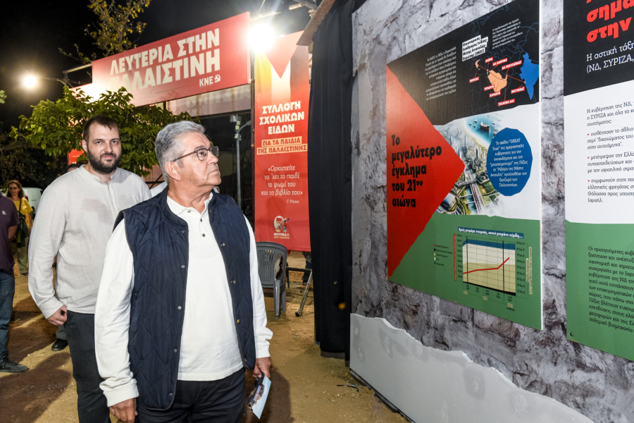 Συνοδευόμενος από τον Θοδωρή Χιώνη, μέλος του ΠΓ της ΚΕ του ΚΚΕ, και τον Θοδωρή Κωτσαντή, Γραμματέα του ΚΣ της ΚΝΕ, παρευρέθηκε στον χώρο αλληλεγγύης της Παλαιστίνης, όπου η ΚΝΕ συλλέγει σχολικά είδη για τα παιδιά της Παλαιστίνης, και δήλωσε πως «Σε αυτόν εδώ τον χώρο του Φεστιβάλ της ΚΝΕ που βρισκόμαστε αυτές τις τέσσερις μέρες, η ΚΝΕ συγκεντρώνει ήδη σχολικά για τα παιδιά της Παλαιστίνης.