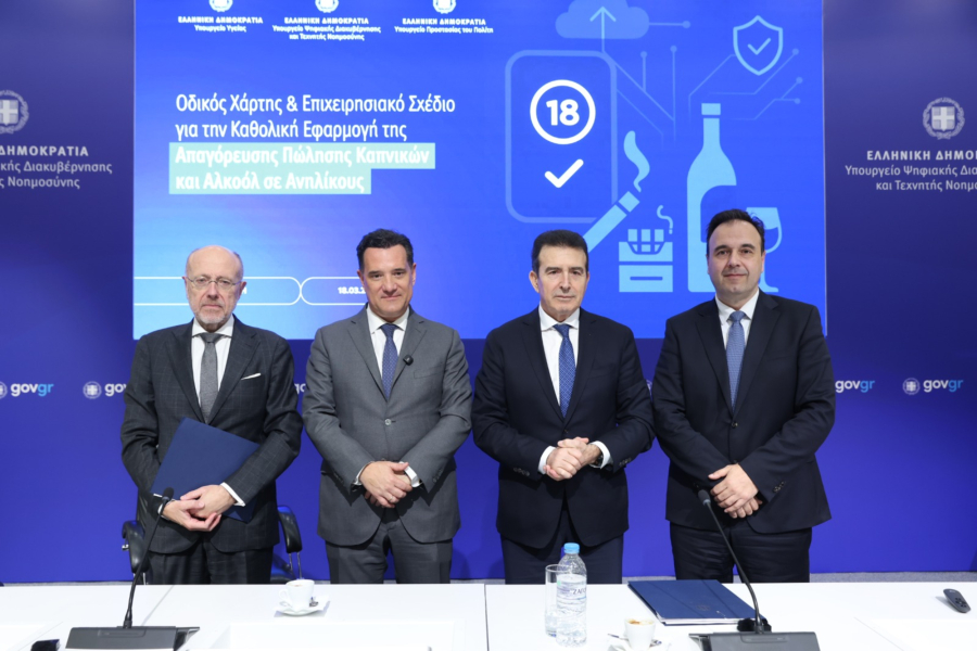Συνέντευξη Τύπου στο υπουργείο Ψηφιακής Διακυβέρνησης παραχώρησαν νωρίτερα την Τετάρτη οι υπουργοί Υγείας Άδωνις Γεωργιάδης, Ψηφιακής Διακυβέρνησης Δημήτρης Παπαστεργίου, Προστασίας του Πολίτη Μιχάλης Χρυσοχοΐδης και ο υφυπουργός Υγείας Δημήτρης Βαρτζόπουλος, όπου παρουσίασαν τον «Οδικό Χάρτη και το Επιχειρησιακό Σχέδιο για την Καθολική Εφαρμογή της Απαγόρευσης Πώλησης Καπνικών Προϊόντων και Αλκοόλ σε Ανήλικους».