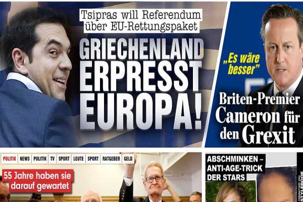 Η εφημερίδα Bild έχει τον τίτλο :«Tώρα καταφεύγει η Ελλάδα στο ύστατο μέσο: Εκβιάζει την Ευρώπη! Με ένα δημοψήφισμα!» και προσθέτει: «Εκρηκτικό: το δημοψήφισμα θα γίνει μόλις το επόμενο Σαββατοκύριακο, στις 5 Ιουλίου. Αυτό σημαίνει, μόνο μετά την εκπνοή του β' πακέτου βοήθειας για την διάσωση της Ελλάδας! Με αυτό ο Τσίπρας κάνει άνω-κάτω όλο το έως τώρα χρονοδιάγραμμα. Διότι ήδη στην 1η Ιουλίου απειλείται η χώρα πολύ συγκεκριμένα με χρεοκοπία». Η εφημερίδα κάνει λόγο για εκβιασμό του πρωθυπουργού και τονίζει: «Αν οι δανειστές δεν δώσουν ως την Τρίτη νέα χρήματα, θα προκύψει αδυναμία πληρωμής. Τότε οι δανειστές θα χάσουν τουλάχιστον ένα μέρος των δανείων τους. Σε όρους για νέα χρηματοδότηση ο Έλληνας πρωθυπουργός δεν θα συμφωνήσει - αφού θα μπορεί να παραπέμπει στο δημοψήφισμα. Στις χώρες του ευρώ, στο ΔΝΤ και στην ΕΚΤ απομένει άρα μόνο να δώσουν ως την Τρίτη νέα χρήματα ή να ρισκάρουν μια χρεοκοπία....». Σύμφωνα δε με την εφημερίδα, η ελληνική κυβέρνηση γνώριζε ότι οι δανειστές δεν επρόκειτο να συμφωνήσουν σε κούρεμα χρέους, άρα δεν θα μπορούσε να εξασφαλίσει την στήριξη του κόμματός του.
