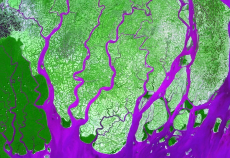 1: Ο Γάγγης ποταμός σχηματίζει ένα εκτεταμένο δέλτα όπου εισέρχεται στον Κόλπο της Βεγγάλης. Το δέλτα καλύπτεται σε μεγάλο βαθμό από βαλτώδες δάσος γνωστό ως Sundarbans, το οποίο φιλοξενεί τη Βασιλική Τίγρη της Βεγγάλης.
