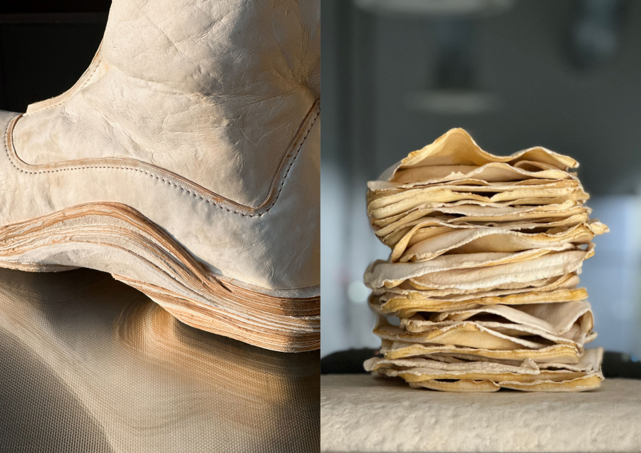 Η διαδικασία κατασκευής αποτελεί ένα σημείο συνάντησης βιολογίας και παραδοσιακής τέχνης, μεταφράζοντας τη φυσική ανάπτυξη σε μορφή. Η συνεργασία επανεξετάζει τις παραδοσιακές τεχνικές υποδηματοποιίας και προσαρμόζει τη μέθοδο πολυστρωματικής συγκόλλησης των δερμάτινων σολών ώστε να λειτουργεί με το μυκήλιο σύμφωνα με τις δικές του ιδιότητες. Το αποτέλεσμα είναι μια μπότα με στιβαρή σιλουέτα, κατασκευασμένη σε στρώσεις που αφήνουν ορατό το πάχος και τη δομή της. Οι εμφανείς ραφές και τα πολυεπίπεδα άκρα δεν κρύβουν τις ατέλειες, αλλά αντίθετα αναδεικνύουν τον χαρακτήρα του υλικού.