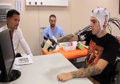 Από τετραπληγία -απώλεια κίνησης σε άνω και κάτω άκρα- πάσχει περίπου ένας στους 10.000 ανθρώπους στον κόσμο. Για να υπάρξει μια μερική αποκατάσταση της κινητικότητας των ασθενών, οι επιστήμονες μέχρι σήμερα έχουν δοκιμάσει την εμφύτευση συσκευών (διεπαφών) εγκεφάλου-μηχανής, που «μεταφράζουν» τα σήματα του εγκεφάλου των παράλυτων ανθρώπων σε εντολές προς κάποιο εξωτερικό ρομπότ. Όμως η εμφύτευση με χειρουργική επέμβαση είναι μια επεμβατική διαδικασία που κρύβει κινδύνους.