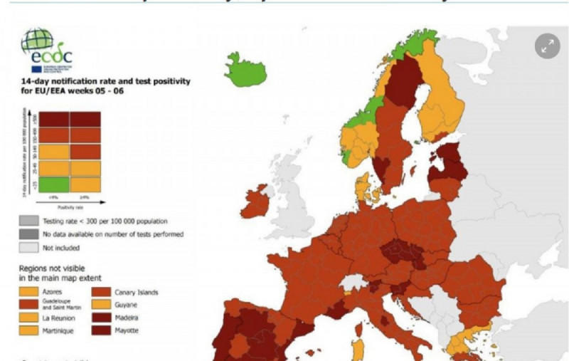 Ειδικότερα, για τις 14 ημέρες πριν τις 18 Φλεβάρη, η Ελλάδα στο μεγαλύτερο μέρος της βρίσκεται στο «κίτρινο» σε αντίθεση με την πλειοψηφία των ευρωπαϊκών χωρών που βρίσκονται στο «κόκκινο». Οι περιοχές με κόκκινο χρώμα είναι αυτές που έχουν ποσοστό θετικότητας των τεστ τους πάνω από 4% σε συνδυασμό με παραπάνω από 50 κρούσματα ανά 100 χιλιάδες πληθυσμού.
