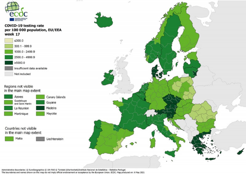 Αισιόδοξα για ακόμη μία φορά είναι τα νέα από το ECDC, καθώς η Ελλάδα είναι ξανά στο πράσινο χρώμα όσον αφορά στον δείκτη θετικότητας (κάτω από 4%), ενώ βρίσκεται σε κορυφαίο επίπεδο στην Ευρώπη όσον αφορά το testing (με περισσότερα από 5.000 τεστ ανά 100.000 κατοίκους).