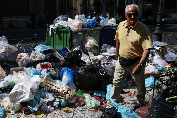Σκουπίδια σωρεύονται στους δρόμους της Αθήνας λόγω των κινητοποιήσεων των εργαζόμενων στην Τοπική Αυτοδιοίκηση.