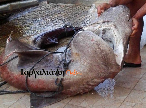 Ο μεγαλόσωμος καρχαρίας ανέβηκε στο αλιευτικό σκάφος με δυσκολία αφού το βάρος του ξεπερνούσε τα 180 κιλά!
