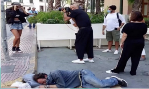 Ο κριτής του GNTM Δημήτρης Σκουλός, εμφανίζεται να φωτογραφίζει μια κοπέλα ενώ δίπλα τους κοιμάται ένας άστεγος.