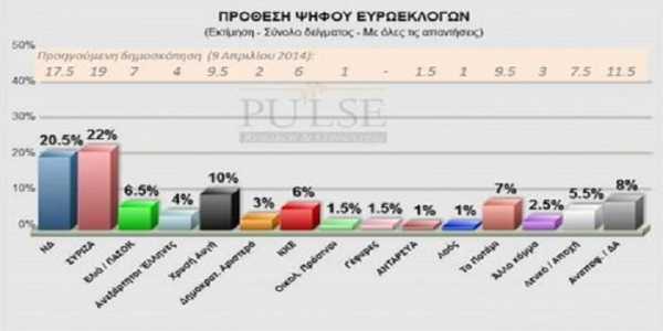 Στην Πρόθεση Ψήφου της έρευνας της Pulse ο ΣΥΡΙΖΑ (22% από 19% τον Απρίλιο) και η Ν.Δ. (20,5% από 17,5%) εμφανίζονται ισόποσα ενισχυμένοι κατά 3% συγκριτικά με την έρευνα της 9η Απριλίου. Στην τρίτη θέση παραμένει η Χρυσή Αυγή, ενισχυμένη κατά 0,5% (10% από 9,5%), αλλά χωρίς... συγκάτοικο, αφού το Ποτάμι, τον μήνα μεταξύ των δύο δημοσκοπήσεων, βρέθηκε στο 7% (από 9,5% τον Απρίλιο).
