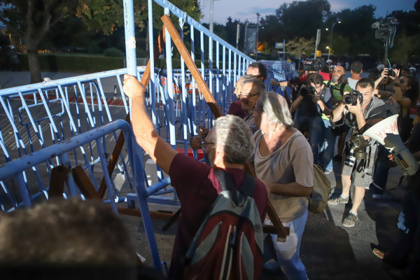 Οι συμμετέχοντες στην πορεία κινήθηκαν προς τον φραγμό και προσπάθησαν να περάσουν από το σημείο, χωρίς, ωστόσο, να τα καταφέρουν.